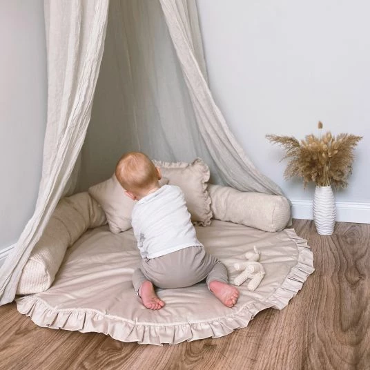 Der kuschelig weiche Stoff aus hautfreundlicher Bio-Baumwolle macht die sΓΌΓe Krabbeldecke zu einer kleinen Traumoase. Das bezaubernde Design βVolantβ mit niedlichen RΓΌschen am Rand und zeitlosem, hellem Beigeton mit zarter Musterung lassen die Decke schnell zum besonderen Hingucker werden.