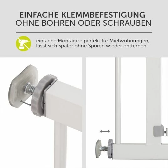 Das Klemmgitter kannst Du einfach und ohne zusätzliches Werkzeug montieren. Du musst keine Löcher in die Wände bohren. Dadurch eignet sich das Schutzgitter ideal für Mietwohnungen oder wenn Du Deine Wände nicht beschädigen willst. Wenn Du das Gitter später nicht mehr brauchst, lässt es sich ohne Spuren wieder entfernen.