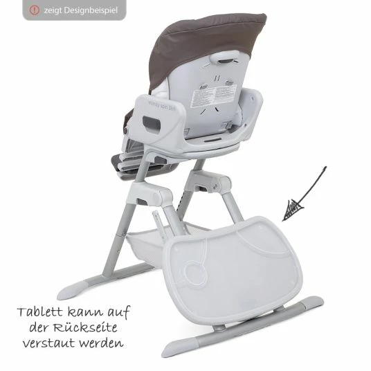 Bei Nicht-Bedarf kannst Du das Tischchen abnehmen und an der Rückseite des Hochstuhls befestigen. Hier befindet sich eine praktische Aufbewahrungshalterung dafür. Nun kannst Du den Hochstuhl ganz nah an den Esstisch heranschieben, sodass Dein Kind mit am Tisch essen kann.