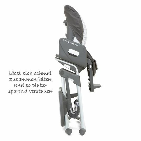 Der Spin 3in1 ist im Handumdrehen zusammengeklappt. In diesem Zustand steht er frei. Dank der kompakten Klappmaße kannst Du den Hochstuhl nun gut lagern oder transportieren.