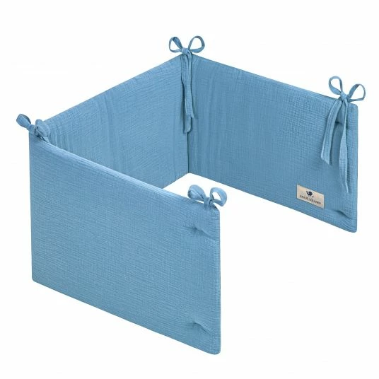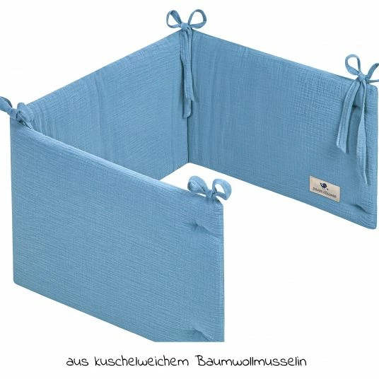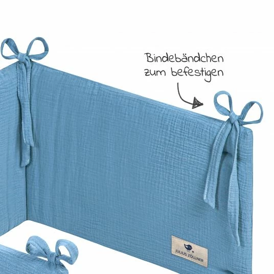 Schnell ist’s passiert: Während dem Schlaf dreht sich Dein Kleines um und stößt sich an den Gitterstäben seines Bettchens. Damit das nicht passieren kann und Dein Baby rundum geschützt liegt, ergänzt das Julius Zöllner Nestchen Jersey 180 x 35 cm – Blau die Traumoase perfekt. Der Bezug besteht aus kuscheligem Baumwoll-Musselin und ist ideal für die zarte Babyhaut.