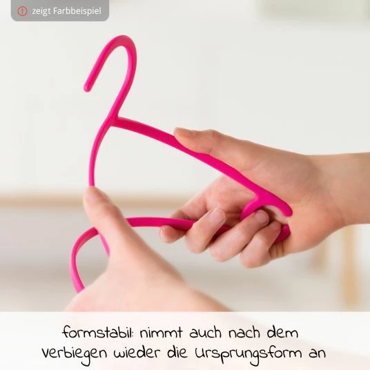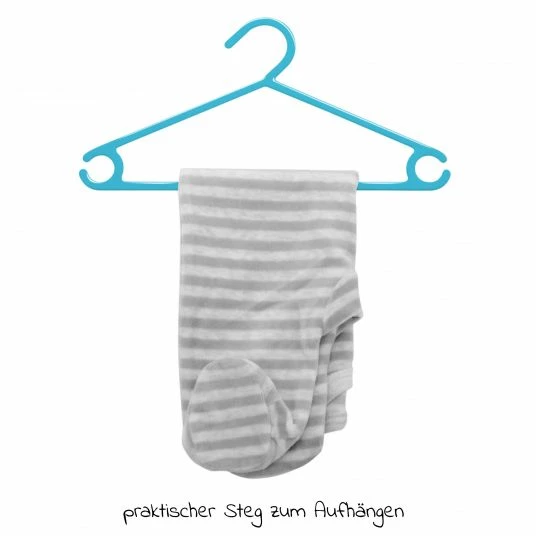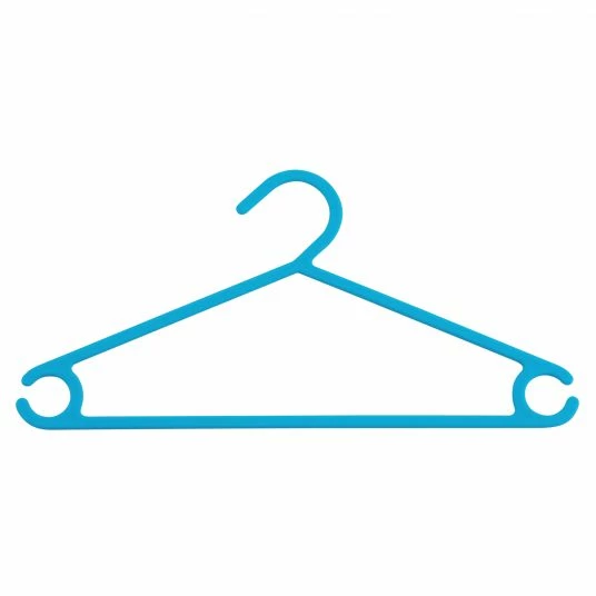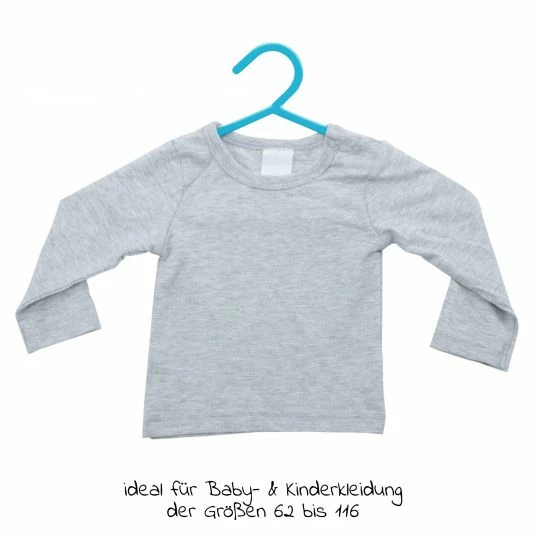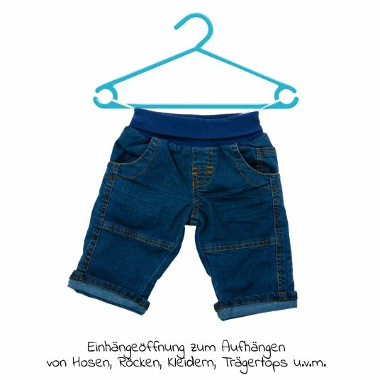 Practical 8er Pack coat hanger in blue from Laloona for more overview and order in the wardrobe. The sturdy universal clothes hangers offer various hanging options for your child’s clothes. The hanger can be used to hang up tops, rompers, dresses and jackets crease-free. You can put trousers and skirts over the pole. Clothes with sewn-in loops can be hung from the large hooks on the sides. Due to their size, the hangers are ideal for baby and children’s clothing and can be used for a long time. The turquoise-blue brings cool colour accents into the children’s room.