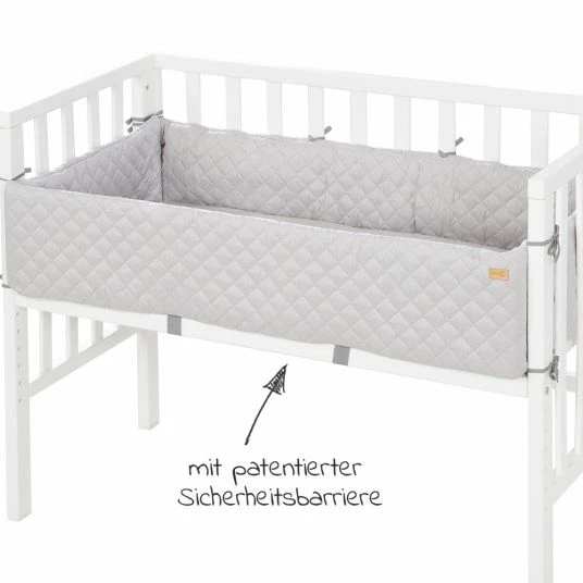 Das Beistellbett sowie die komplette Ausstattung ist TÜV geprüft und mit einer Sicherheitsbarriere nach den aktuellsten Sicherheitsstandards der Norm EN 1130:2019 entwickelt und produziert. Alle verwendeten Materialien sind schadstoffgeprüft, zertifiziert und werden regelmäßig kontrolliert. Der verwendete Lack ist lebensmittelecht und hautverträglich.