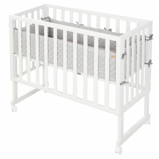 Tagsüber befestigst Du das beiliegende Seitengitter am Beistellbett und verwandelst es so in ein sicheres Babybett. Das Seitengitter lässt sich ganz einfach wieder auf Knopfdruck entfernen.