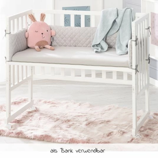 Das 3 in1 Stubenbett, Roba Style Silbergrau Weiß von Roba ist als Beistellbett zum Elternbett, Stubenbett und später auch als Sitzbank verwendbar. Es ist von Geburt an geeignet. Das Bettchen beinhaltet eine Babymatratze 45 x 90 cm aus PU-Schaumstoff, ein gepolstertes Nestchen und eine Sicherheitsbarriere im Roba Style Design.