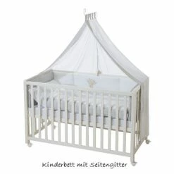 The Bed set Little Stars by Roba transforms your crib into a cuddly oasis that leaves little sleeps to dream about. The set consists of a two-piece bed linen (blanket and pillow cover), a nest and a canopy with play element. The soft nest serves as padding for the grids and is simply attached to the children’s bed with Bändern. The romantic, slightly transparent sky is attached to a separately available sky bar above the bed and already provides a pleasant ambience. All parts of the set are made of cotton, perfectly coordinated and in the beautiful star design.