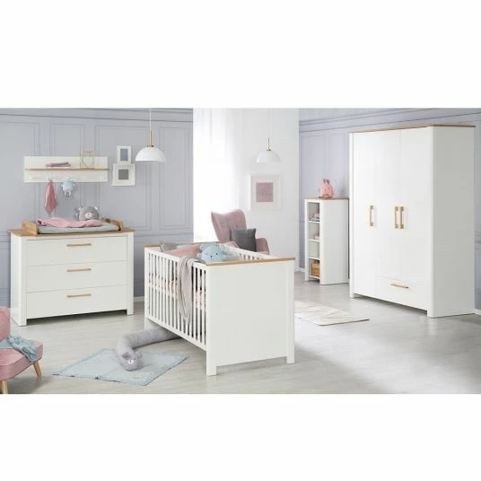 Das Zimmer besteht aus einem komfortablen Babybett, einer breiten Wickelkommode und einem großem 3-türigen Kleiderschrank mit 1 Schublade.
