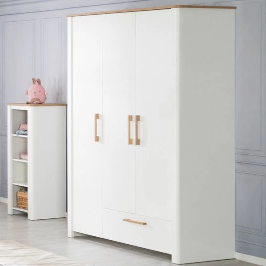 Der Kleiderschrank Ava bietet in insgesamt 7 Fächern und in 1 zusätzliche Schublade jede Menge Platz für Babys Kleidung, Spielsachen und mehr. An einer Kleiderstange kannst Du Schlafsack, Jäckchen und Kleidchen knitterfrei aufhängen und hast so immer alles gut untergebracht. Die Türen sind mit der Soft-Close-Technik ausgestattet. Die Türdämpfung schließt die Türen sanft und leise. Die Schublade ist mit der Soft-Close-Technik ausgestattet. Die Schubladendämpfung schließt die Schublade sanft und leise. Das heißt, kleine Finger werden nicht eingeklemmt. Ein optisches Highlight stellen die Möbelgriffe aus massiver, lackierter Eiche dar.
