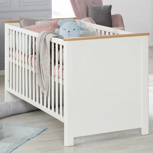 Das Kinderbett Ava ist bequem und schön zugleich. Der Lattenrost lässt sich 3-fach in der Höhe verstellen. Wenn Dein Baby noch klein ist, eignet sich vor allem eine höhere Position, damit Du es bequem und rückenschonend in das Bettchen hineinlegen und wieder herausheben kannst. Sobald Dein Kleines älter wird, verstellst Du den Lattenrost weiter nach unten. Dank der 3 Schlupfsprossen entsteht eine praktische Öffnung, durch die der Nachwuchs sein Bett nun selbstständig verlassen kann – und das ganz ohne abenteuerliche Kletterpartien. Die Fronten sind ohne sichtbare Schrauben.