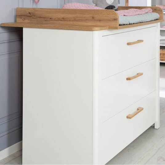 Beim Kinderzimmer Ava von Roba sind die Wickelplatte der Kommode, die Deckplatte beim Schrank und der Handlauf beim Bett im Dekor Artisan Eiche. Das bildet einen schönen Kontrast zu den Weißen Fronten und den Möbelgriffen aus Eiche. Die Stollen (Möbelkanten) der Möbel sind kindgerechte abgerundet.