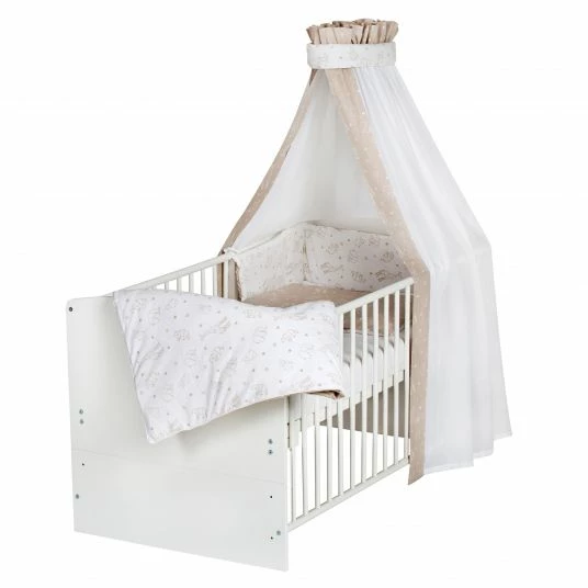 Das Babybett-Komplett-Set Classic-Line von Schardt inkl. Bettwäsche, Himmel, Nestchen und Matratze beinhaltet alles, was Dein Kleines für einen erholsamen Schlaf braucht. Das Bett kann sehr lange verwendet werden, da es mit Deinem Liebling mitwächst: Der Rost lässt sich für das Kleinkindalter 3-fach in der Höhe verstellen, dank des beiliegenden Umbaukits verwandelt es sich später sogar in ein Juniorbett für Schulkinder.
