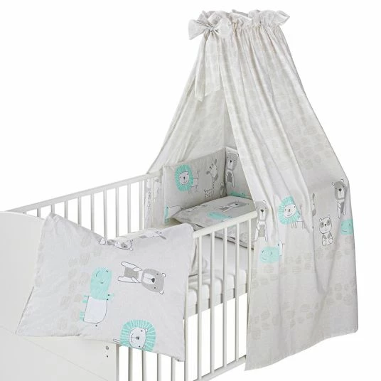 Das süße 4-teilige Bettwäsche-Set – Exklusiv Design Wallis – Grau von Schardt besteht aus reiner, hautfreundlicher Baumwolle. Himmel, Nestchen, Decken- und Kissenbezug sind im exklusiven Wallis Design, das Mädchen und Jungen gleichermaßen gut gefällt.